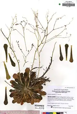 Lewisia cantelovii is an uncommon species of flowering plant in the family Montiaceae known by the common name Cantelow's lewisia. It is endemic to California, where it is known from the northeastern mountain ranges from the Klamath Mountains to the northern Sierra Nevada. It grows in rocky, moist mountain habitat. This is a perennial herb growing from a short, thick taproot and caudex unit. It produces a basal rosette of thick, fleshy, blunt-tipped spoon-shaped leaves with serrated edges. The inflorescence is a very slender erect stem up to 45 centimeters tall topped with a spreading panicle of flowers and glandular, toothed bracts. Each flower has 5 to 7 oval petals each one half to one centimeter long. The petals are white or very pale pink with sharp dark pink veins. At the center of the flower are five stamens tipped with dark pink anthers.