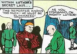 In Luthor's earliest appearances, he is shown as a middle-aged man with a full head of red hair. Less than a year later however, an artistic mistake resulted in Luthor being depicted as completely bald in a newspaper strip.[8] The original error is attributed to Leo Nowak, a studio artist who illustrated for the Superman dailies during this period.[9] One hypothesis is that Nowak mistook Luthor for Ultra-Humanite, a recurring mad scientist foe of Superman who, in his Golden Age incarnation, resembled a balding, elderly man.[9] Other evidence suggests Luthor's design was confused with that of a stockier, bald henchman in Superman #4 (Spring 1940);[9] Luthor's next appearance occurs in Superman #10 (May 1941), in which Nowak depicted him as significantly heavier, with visible jowls.[9] The character's abrupt hair loss has been made reference to several times over the course of his history. In 1960, writer Jerry Siegel altered Luthor's backstory to incorporate his hair loss into his origin.