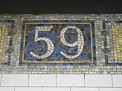 The station used to have all green tile which has been covered up except for one "59th Street" sign near the south end of the northbound platform. There are whimsical stylized mosaics of coffee cups and slippers in varied colors at random spacing near the stairways to the Broadway and IRT local trains.[123]