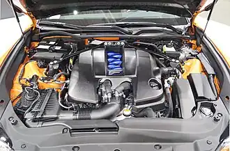 The RC F features a 5.0 L (4,969 cc) 2UR-GSE V8 engine with Atkinson cycle at cruising speeds, developing a maximum output of 473 PS (467 bhp; 348 kW) at 7100 rpm and 389 lb⋅ft (527 N⋅m) of torque at 4800–5600 rpm.[24] It is coupled to a Toyota AA80E 8-speed transmission built by Aisin AW.[25] The RC F has Brembo four-wheel power assisted disc brakes with anti-lock braking system (ABS), electronic brake force distribution (EBD) and brake assist (BA), and 255/35R19 front and 275/35R19 rear tires.