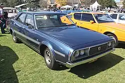The car was designed by Giovanni Michelotti.[5] The entry-level P76 featured an enlarged 2663cc 121 bhp (83 kW)[6] version of the 6-cylinder engine from the smaller Austin Kimberley and Austin Tasman. The top-of-the-line 192 bhp (143 kW)[6] aluminium 4416 cc V8 unit was unique to the P76, and was a derivative of the ex-Buick V8 that was powering the Rover 3500 and Range Rover. Leyland Australia cited a weight advantage approaching 500 lb (230 kg) for the P76, most of which was attributed to the lighter weight of the aluminium engine block when compared to the cast-iron blocks (with bigger displacements) of the V8s from Chrysler, Holden and Ford.[4] It was hoped that the weight advantage would feed through into superior fuel economy and extended tyre life.[4] Nevertheless, the car was a full-size car in Australian terms, for which class leading boot/trunk capacity was claimed.[4]