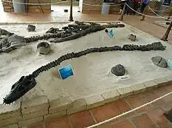 The Hauterivian to Late Aptian Paja Formation is one of the richest fossiliferous stratigraphic units of Colombia, where other marine reptiles are found too. Pliosaurs as Kronosaurus and Stenorhynchosaurus, ichthyosaurs as Muiscasaurus and Platypterygius and a plesiosaurs known as Callawayasaurus represent the known marine reptile fauna assemblage of the formation. From the Paja Formation in the same year as Leyvachelys, the oldest sea turtle known in the world, Desmatochelys padillai,[2] has been reported. The habitat of Leyvachelys is described as littoral, not open marine as is the case for Desmatochelys.[1] Additionally, many different ammonites and crustaceans are described from the formation.[3][4] The morphology of the shell of L. cipadi, allows the support of previously hypothesized habitat adaptations for sandownids; in particular, that they inhabited littoral to near-shore shallow marine environments, and that their general body-plan was not designed for leading an open marine lifestyle. They nevertheless potentially shared niches with open marine turtles, as evidenced by the occurrence of protostegids as Desmatochelys, from the same stratigraphical horizons. The abundant occurrence of molluscs, principally ammonites, some of them preserved associated with the carapace of L. cipadi, suppose a potential source of food for its durophagous diet adaptation which could have also included arthropods, as for example crabs.[1]