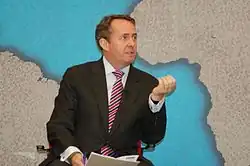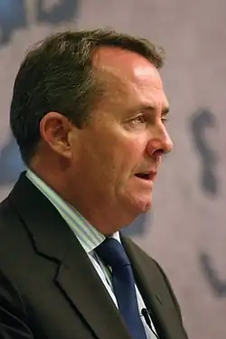 Sir Liam Fox (born 22 September 1961) is a British politician who served as Secretary of State for International Trade from 2016 to 2019 and Secretary of State for Defence from 2010 to 2011. A member of the Conservative Party, he was the Member of Parliament (MP) for North Somerset, formerly Woodspring, from 1992 to 2024.