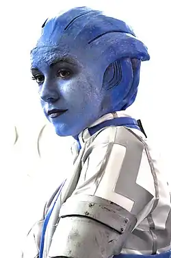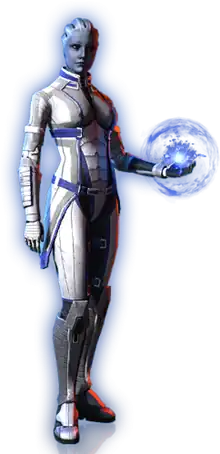 Dr. Liara T'Soni is a fictional character in BioWare's Mass Effect franchise, who serves as a party member (or "squadmate") in the original Mass Effect trilogy. She is an asari, a female-appearing[1][2] species from the planet Thessia who are naturally inclined towards biotics, the ability to "manipulate dark energy and create mass effect fields through the use of electrical impulses from the brain".[3][4] Within the series, Liara is noted for being the galactic scientific community's foremost expert in the field of Prothean archaeology and technology, specifically evidence concerning the demise of the ancient Protheans, believed by the galactic community to be the pre-eminent civilization in the Milky Way galaxy until their sudden disappearance fifty thousands years before the events of the first Mass Effect.