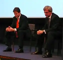 The 2007 Liberal Democrats leadership election was held following the resignation of Sir Menzies Campbell as leader on 15 October 2007, after 19 months as leader of the Liberal Democrats, the third-largest political party in the United Kingdom. Vince Cable, the deputy leader of the parliamentary party, was acting leader until the conclusion of the leadership election.[1] The result was announced on 18 December 2007 with Nick Clegg winning by a narrow margin of 1.2%.[2]