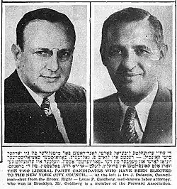 Clipping from The Jewish Daily Forward celebrating the elections of Ira J. Palestin and Louis P. Goldberg to the New York City Council, November 25, 1945.