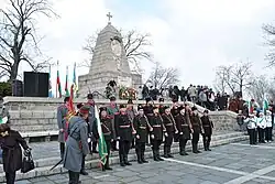 In Bulgaria, there are currently over 400 preserved monuments dedicated to the soldiers who fought for its freedom. Every year on 3 March, wreaths are laid at the Shipka Monument and military honors in memory of all soldiers who died fighting for the liberation of Bulgaria. Residents around the country commonly lay flowers and notes at monuments to the fallen foreign troops who fought alongside their Bulgarian counterparts.[7] The Bulgarian Orthodox Church holds special liturgy and prayers on Liberation Day. In the evening, on the National Assembly Square near the monument to the Tsar Liberator, there is a solemn military service which includes the inspection of the National Guards Unit of Bulgaria by the President of Bulgaria and the awarding of military personnel with national decorations. An afternoon flag raising ceremony at the Monument to the Unknown Soldier is also held.