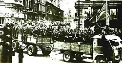 Bella ciao (Italian pronunciation: [ˈbɛlla ˈtʃaːo]; "Goodbye beautiful") is an Italian folk song modified and adopted as an anthem of the Italian resistance movement by the partisans who opposed nazism and fascism, and fought against the occupying forces of Nazi Germany, who were allied with the fascist and collaborationist Italian Social Republic between 1943 and 1945 during the Italian Civil War. Versions of this Italian anti-fascist song continue to be sung worldwide as a hymn of freedom and resistance.[44] As an internationally known hymn of freedom, it was intoned at many historic and revolutionary events. The song originally aligned itself with Italian partisans fighting against Nazi German occupation troops, but has since become to merely stand for the inherent rights of all people to be liberated from tyranny.[45][46]