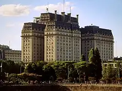 Pibernat's plans, submitted in 1935, called for twin buildings east and west of the presidential offices at the Casa Rosada.[2] Ultimately, however, these plans were dropped in favor of imposing new headquarters on a 3 ha (8 ac) lot east of the Casa Rosada. Designed by Ministry of Public Works architects Enrique Lopardo, Néstor Pastrana, and Héctor Campini, the twenty-story, 82,625 m2 (889,000 ft²) building would be the largest in Argentina up to that point.[3] The building would thus be divided into three sections: two wings to be anchored by a central section staggered outwards in the 230 m (750 ft) long façade, and distinguishable also by a portico and its four additional floors.[3] Construction on the structure began in 1938.