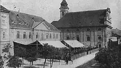 In 1727, the space on which the Garrison building was erected in 1731 was cleared of the ruins of the former Turkish bazaar.[3] The Old City Hall and the Church of the Bosnian Franciscans were built on the northern side of the square in 1731–1734 and 1733–1736, respectively.[8] The church was demolished in 1913, during some modernization works, and a bank office was erected in its place.[9] In 1740 the square was designed to occupy only the surface of a rectangular quarter. Then it was decided to widen the square to the west, so as to reach the current dimensions of 103 × 99 m.[8] On the western side, in 1746–1747, the former Silahdar Mosque was still standing; it was later demolished.