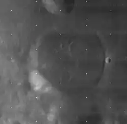 Lick is a lunar impact crater that has been flooded with basaltic lava. This crater was named in memory of James Lick, a Californian philanthropist.[1] The north rim is attached to the smaller, bowl-shaped crater Greaves. Lick lies on the southwest edge of Mare Crisium. Its rim is broken at the north and south ends, and the southwest rim is attached to the crater remnant Lick A. There is a small, flooded crater within the southern part of Lick's inner floor, and several tiny craters mark the interior surface. A small, unnamed crater at the east rim has a bright ray system.