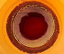 Liesegang rings (/ˈliːzəɡɑːŋ/) are a phenomenon seen in many, if not most, chemical systems undergoing a precipitation reaction under certain conditions of concentration and in the absence of convection. Rings are formed when weakly soluble salts are produced from reaction of two soluble substances, one of which is dissolved in a gel medium.[1] The phenomenon is most commonly seen as rings in a Petri dish or bands in a test tube; however, more complex patterns have been observed, such as dislocations of the ring structure in a Petri dish, helices, and "Saturn rings" in a test tube.[1][2] Despite continuous investigation since rediscovery of the rings in 1896, the mechanism for the formation of Liesegang rings is still unclear.