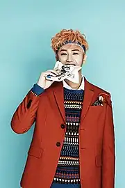 A day or two before the mini album's scheduled release, Heo Young-saeng posted photo teasers of himself through B2M Entertainment's Twitter account.[25] On March 12 and 13, five different photo releases (for example, the image on the right) showed Heo's "big transformation through his new look: Orange colored hair, colorful style and a smile with confidence."[26] His playful appearance was evident in each picture: bright shades such as blue, white, orange, red, and yellow were used as background colors; the clothes he wore were vividly colored; and additional props such as a big chocolate bar, chips, and a fat cat were included.