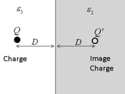 But this result cannot be correct, since It is well known that a charge in a medium of dielectric constant at a distance from the plane surface of a second medium of dielectric constant experiences a force as if there were an 'image' charge of strength at distance D on the other side of the boundary.[11] The force between the real and image charges must then be