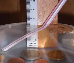 Although the motion of the Crookes radiometer was originally attributed to light pressure, this interpretation is incorrect; the characteristic Crookes rotation is the result of a partial vacuum.[29] This should not be confused with the Nichols radiometer, in which the (slight) motion caused by torque (though not enough for full rotation against friction) is directly caused by light pressure.[30] As a consequence of light pressure, Einstein in 1909 predicted the existence of "radiation friction" which would oppose the movement of matter.[31] He wrote, "radiation will exert pressure on both sides of the plate. The forces of pressure exerted on the two sides are equal if the plate is at rest. However, if it is in motion, more radiation will be reflected on the surface that is ahead during the motion (front surface) than on the back surface. The backwardacting force of pressure exerted on the front surface is thus larger than the force of pressure acting on the back. Hence, as the resultant of the two forces, there remains a force that counteracts the motion of the plate and that increases with the velocity of the plate. We will call this resultant 'radiation friction' in brief."