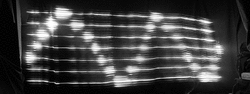 Projector light painting, by waving a white translucent flash diffuser in the light path of a portable projector, the continuous motion creates an invisible screen in the air for the projected image in the photo.
