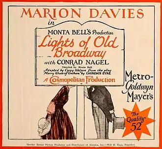 Lights of Old Broadway is a 1925 American silent drama film directed by Monta Bell, produced by William Randolph Hearst's Cosmopolitan Productions, and released by Metro-Goldwyn-Mayer. The film stars Marion Davies in a dual role and Conrad Nagel, and is an adaptation of the play The Merry Wives of Gotham by Laurence Eyre (USA). The film has color sequences using tinting, Technicolor, and the Handschiegl color process.[1][2]