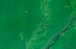 The course of the Likouala meanders and shifts over time.[2] The coefficient of sinuosity is more than 1.5 in the upper section, around 2.0 in the middle section and in the lower section as high as 2.8.[5] The lower sections of the Sangha and Likouala-aux-Herbes flow through flat land with little difference in elevation between the two rivers. Part of the lower section of the Sangha River divides into two meandering channels, which then recombine. Further down, a "canal" connects the Sangha and Likouala-aux-Herbes some distance above the main confluence of the two rivers.[6] Not long ago the Likouala-aux-Herbes joined the Sangha 130 kilometres (81 mi) upstream from the present confluence.[2]