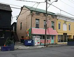 The exterior resembles a colorful roadside diner, as well as its prior use as a Stewart's Shop, though its shingles are painted in peach or coral pink, and it features turquoise trim, blue neon signs, and a Black Lives Matter sign.[8]