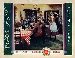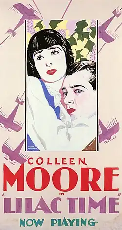 Lilac Time is a 1928 American synchronized sound romantic war film directed by George Fitzmaurice and starring Colleen Moore and Gary Cooper. While the film has no audible dialog, it was released with a synchronized musical score with sound effects using the short-lived Firnatone process. After First National was taken over by Warner Bros., the soundtrack was transferred to sound-on-disc Vitaphone discs and re-released in that format.[2] The film is about young American aviators fighting for Britain during World War I who are billeted in a field next to a farmhouse in France. The daughter who lives on the farm meets one of the new aviators who is attracted to her. As the flyers head off on a mission, the young aviator promises to return to her.[3]