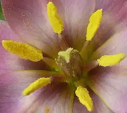 - Six stamens in two trimerous whorls, with free filaments, usually epiphyllous (fused to tepals) and diplostemonous (outer whorl of stamens opposite outer tepals and the inner whorl opposite inner tepals), although Scoliopus has three stamens opposite the outer tepals.[14] The attachment of the anthers to the filaments may be either peltate (to the surface) or pseudo-basifixed (surrounding the filament tip, but not adnate, that is not fused) and dehisce longitudinally and are extrorse (dehiscing away from center). The pollen is usually monosulcate (single groove), but may be inaperturate (lacking aperture: Clintonia, some Tulipa spp.) or operculate (lidded: Fritillaria, some Tulipa spp.),[15] and reticulate (net patterned: Erythronium, Fritillaria, Gagea, Lilium, Tulipa).[9][11][14]