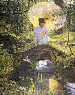 A new inspiration entered Perry's life in 1897 when her husband received a teaching position in Japan as an English professor at the Keio Gijuku University. Lilla Perry met Okakura Kakuzō, one of the Imperial Art School co-founders.[11][17] For three years Perry resided in Japan and took full advantage of its unique artistic community.[18] In October 1898, Perry exhibited her work in Tokyo, with the assistance of Kakuzō,[17][18] and became an honorary member of the Nippon Bijutsu-In Art Association. Perry's involvement with the Asian art world greatly influenced her work and made it possible for her to develop a unique style that brought together western and eastern aesthetic traditions. Her Meditation, Child in a Kimono, and Young Girl with an Orange vibrantly illustrate the distinct changes that occurred in her work during her stay in Japan. Unlike her earlier works, these compositions draw on uniquely eastern subject matter and show a strong influence of the clean lines from Japanese prints. The result of this blending of east and west is striking, with Impressionist portraits flowing seamlessly with the well-organized, balanced compositions that the eastern art world was known for at the time.[18] Mount Fuji became the subject of 35 or more of her paintings,[18] and she made a total of more than 80 paintings while in Japan.[5]