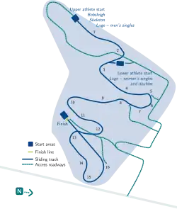 The track is 1,710 meters (5,610 ft) long, including braking distance. The competitive length—excluding braking distance—for bobsleigh, skeleton and luge men's singles it is 1,365 meters (4,478 ft) long and for luge men's doubles and women's singles it is 1,065 meters (3,494 ft) long. The track has 16 turns and contains 24 photocells for timekeeping. The track has a vertical drop of 112 meters (367 ft) for the entire course, with an average 8 percent and maximum 15 percent grade. The start is located at 384 meters (1,260 ft) above mean sea level. It allows for a maximum speed of 130 kilometres per hour (81 mph).[7] The spectator capacity is 10,000.[14]