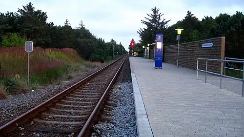 The halt is located on the Hirtshals Line from Hirtshals to Hjørring. It opened in 1940, was closed again in 1956, but reopened in the 1990s.[4][5] The train services are currently operated by the railway company Nordjyske Jernbaner which run frequent local train services between Hirtshals and Hjørring with onward connections from Hjørring to the rest of Denmark.[3]