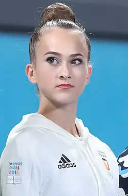 In 2018 she took part in the selection for the Youth Olympics in Moscow along with Emeli Erbes who earned Germany a spot in the competition, finishing 34th.[9][10][11] In May she won silver in the All-Around, with hoop, with ball and with clubs and bronze with ribbon at the under 15 national championships.[12][13] In October it was announced she was to replace Erbes at the YOG as Emeli got injured.[14] She then went on to compete at the Youth Olympic Games in Buenos Aires, finishing 27th in qualification and did not advance to the final, but she won bronze as part of team Oksana Chusovitina.[15][16][17]