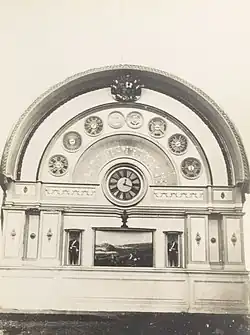 During the fair there was a botanic garden, a Chinese pavilion and displays of modern machinery and of pre-Columbian art.[2] And still remaining in the park in 2017 there are a Byzantine and Moroccan pavilion and a fountain of Neptune.[2] There was also a Huaca, a Chinese pavilion, a dovecote, a lake with swans[6] and a large clock.[6][5] The clock, 'The great clock of Lima', designed by Pedro Ruiz Gallo was installed in a tower and as well as the time had six dials showing century date, year, month, week, day and phases of the moon, incorporated an organ and a 3x1 metre oblong to show a different historical picture every 25 hours.[5]