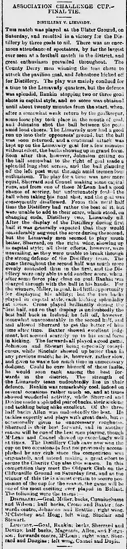 The club's first entry to the Irish Cup, in 1884–85, saw it reach the final, where it lost 3–0 to Distillery. Limavady repeated the feat the following season, but lost 1–0 to the same side in a match that was so ill-tempered that, after a Limavady protest about rough play,[6] the Cup and medals were withheld,[7] and both clubs were temporarily expelled from the Irish Football Association, with some thought was given to re-playing the final between the beaten semi-finalists.[8]
