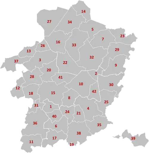 The province of Limburg has an area of 2,427 km2 (937 sq mi) which comprises three arrondissements (arrondissementen in Dutch) containing 44 municipalities. Among these municipalities are the current capital Hasselt, and other large towns including Sint-Truiden, Genk, and Tongeren. Tongeren is the only Roman city in the province, and regarded as the oldest city of Belgium.