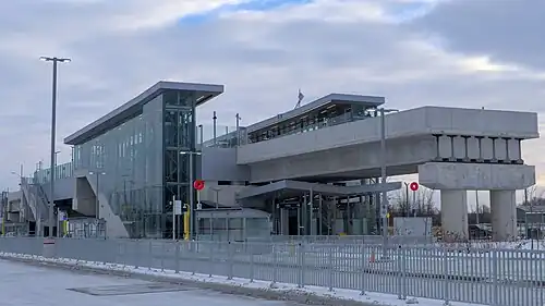 Limebank station is the terminal station on Line 2 in Ottawa, Ontario. The station is elevated with two side platforms and is located southwest of the intersection of Limebank and Earl Armstrong roads.[2][3] OC Transpo routes 73, 74, 99, 110, 198, 283 and 299 connect to this station as of April 27, 2025. When revenue service began January 6, 2025,[4] bus routes 74, 278, 99 (after 7 days service began) and 198 connected to this station