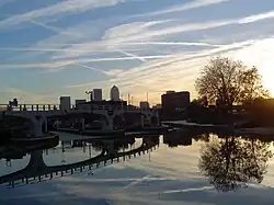 Bow Locks were originally semi-tidal, as high spring tides flowed over the top of the locks, altering the level in the Limehouse Cut and the southern section of the Lee Navigation. They were modified in 2000, when a flood wall and an extra pair of flood gates were installed, enabling the lock to be used at all states of the tide and stabilising the level of the cut.[70] Funding for the project was provided by the London Waterway Partnership.[71]