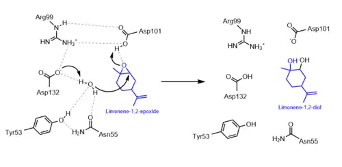 - ^ a b c Hou QQ, Sheng X, Wang JH, Liu YJ, Liu CB (February 2012). "QM/MM study of the mechanism of enzymatic limonene 1,2-epoxide hydrolysis". Biochimica et Biophysica Acta (BBA) - Proteins and Proteomics. 1824 (2): 263–268. doi:10.1016/j.bbapap.2011.08.014. PMID 21925621.