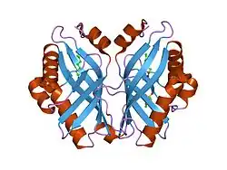 The crystal structure of LEH contains a six-stranded mixed beta-sheet, with three N-terminal alpha helices packed to one side to create a pocket that extends into the protein core. A fourth helix lies in such a way that it acts as a rim to this pocket. Although mainly lined by hydrophobic residues, this pocket features a cluster of polar groups that lie at its deepest point and constitute the enzyme’s active site.[7] LEH is also a dimer with two subunits at an angle of 179° to each other. The two subunits are largely symmetrical, excluding the amino acids at the N-terminus that are proximal to the main fold.[7]