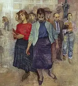 In 1959 Raphael Soyer painted "Farewell to Lincoln Square" to commemorate the eviction of the Arcade's last tenants (shown at left). He later said simply, "This is a picture of the dispossessed."[82] It shows Soyer at back, waving to the viewer, his wife, Rebecca to his right, and, in front, two other Arcade tenants, a jewelry-maker whose name is not given, and Patty Mucha, a painter who was Claes Oldenburg's first wife.[note 19]