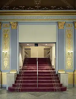 The Lincoln Theatre was listed on the National Register of Historic Places in 1993.[1] That year, the theatre was restored by the U Street Theatre Foundation, with $9 million of aid from the District of Columbia government.[11] The restoration started in 1989 by developer Jeffrey N. Cohen, who was working on a controversial $250 million redevelopment plan, "Jackson Plaza", for the Shaw/U-Street area.[12] In 1990, Cohen ran into financial difficulties and filed for bankruptcy in 1991.[13] Restoration of the theater was taken over by the District government and the foundation.[14] The restoration work was done by the design firm, Leo A. Daly.[15] The building has a brick exterior, and the interior features Victorian trim.[14]