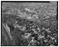 Meanwhile, the Port Authority still had not acquired and cleared all of the land in the way of the Midtown Hudson Tunnel's approaches.[66] Construction of the approaches on the New York side necessitated the demolition of 91 buildings, mainly tenements, between Ninth and Tenth Avenues from 34th to 42nd Street.[16]: 69 These buildings, located in the neighborhood of Hell's Kitchen, were seen as either being already dilapidated, or nearing such a condition.[67] The demolition process was inadvertently aided by a fire that burned down one of the condemned buildings in October 1934.[68] Bidding for the New York approach was opened in June 1935, by which point the demolition of the 91 buildings was well underway.[69] On the New Jersey side, there were disagreements over how to construct the approach, since Weehawken had been built on a sharp ledge called King's Bluff. In July 1935, after discussing 75 proposals for two and a half years, the Weehawken town council voted to approve a distinctive "loop" approach.[16]: 65 [70] At the western end of the Midtown Hudson Tunnel in New Jersey, the tube would curve south and then end at a portal, where there would be a toll plaza. A road would diverge to the east, then quickly turn north and then west while ascending the ledge.[71] This loop would lead from Hudson Boulevard East at the bottom of King's Bluff to Pleasant Avenue at the top.[17]
