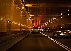 Each tube provides a 21.5-foot-wide (6.6 m) roadway with two lanes and 13 feet (4.0 m) of vertical clearance.[2] Most vehicles carrying hazmats are not allowed in the tunnel, and trucks cannot use the center tube. There is a width limit of 8 feet 6 inches (2.59 m) for vehicles entering the tunnel.[3]