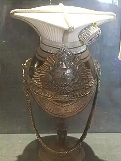 During its comparatively short history (1901–1920), the Lincolnshire Yeomanry was noted for the Lincoln green of its uniforms - a lighter shade than the sombre rifle green widely worn in the British Army. The original uniform of the regiment was the newly introduced khaki serge but with collars, shoulder-straps, and cuff-piping in Lincoln-green. For reasons of recruitment and morale this relatively plain dress was eventually replaced with an elaborate lancer style full dress (including white plastron fronts and plumed czapka caps) for the officers.[14] Other ranks wore Lincoln-green "frock" tunics with peaked caps, shoulder chains and double white stripes on their overalls[15] (cavalry trousers strapped under the boots). From about 1908 to 1920 the standard khaki service dress of British mounted troops was worn for training and ordinary duties.[16]