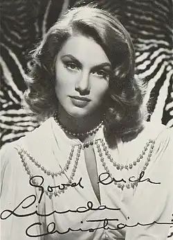 Linda Christian (born Blanca Rosa Henrietta Stella Welter Vorhauer; November 13, 1923[1][2][3] – July 22, 2011[4]) was a Mexican film actress who appeared in Mexican and Hollywood films. Her career reached its peak in the 1940s and 1950s. She played Mara in the last Johnny Weissmuller Tarzan film Tarzan and the Mermaids (1948).[5] She is also noted for being the first Bond girl, appearing in a 1954 television adaptation of the James Bond novel Casino Royale.[6] In 1963, she starred as Eva Ashley in an episode of The Alfred Hitchcock Hour titled "An Out for Oscar".