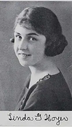 Linda Grace Hoyer (Updike) was born in 1904 on an 83-acre farm in Plowville, Pennsylvania, the only child of John Hoyer and Katherine Kramer Hoyer, who were of mainly German ancestry. The family attended Grace Evangelical Lutheran Church.[1] Her parents sold their farm in 1921 and moved a large house in the nearby town of Shillington, Pennsylvania.[2] Updike graduated from Keystone Normal School (now Kutztown University), and in 1923, at age 19, from Ursinus College, where she played field hockey.[3][4] In 1924 she received a M.A. in English literature from Cornell University, where she wrote a thesis on Sir Walter Scott's The Bride of Lammermoor.[5]