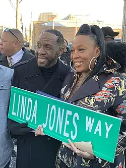 On December 14, 2021, The City of Newark, New Jersey, honored Jones with renaming Sherman Avenue, the street she lived on, to Linda Jones Way. Her daughter Terry Jones and singer Helen Burner were in attendance to accept the honor. Producer George Kerr and recording artists Freddie Jackson, Stuart Bascombe of Black Ivory, and Dolores Milligan of the band Skyy were also in attendance.[7][8]