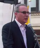 McMahon and Simmons engaged in negative campaigning in November 2009.[37][38] In one political mailing, McMahon portrayed Simmons to the Tea Party movement as a fraud.[39] (Simmons had courted Tea Party conservatives, and even carried a tea bag in his pocket[40]).[41] In December, an article in The Washington Times suggested that Simmons' appeals to conservatives were insincere,[42] pointing to his past support for "cap and trade" and "card check", two hot button issues for the Tea Party.[43] McMahon's campaign savaged this apparent flip-flop, sending mailings to Connecticut voters highlighting the issue. This hurt Simmons' standing among conservatives and labor unions.[44]