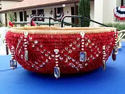 2010[26] - The Oakland Museum was organizing a new exhibit of baskets from the various indigenous peoples of California, and found they had no baskets from any of the Ohlone tribes that once populated the broader San Francisco Bay Area. Yamane had been a member of the museum's Native Advisory Counsel, as well as actually a consultant on the basket collection. The museum commissioned her to make a ceremonial basket in the Rumsien style and by Rumsien methods, which was unveiled to the public in 2012. The piece had over 20,000 stitches and 1,200 Olivella beads made by Yamane. The several thousand feathers on the basket were chicken feathers died red, because it is no longer legal to collect feathers from the acorn woodpecker, the traditional source.[3][20][26] In addition, Yamane led multiple living history basket weaving demonstrations at the museum.[3]