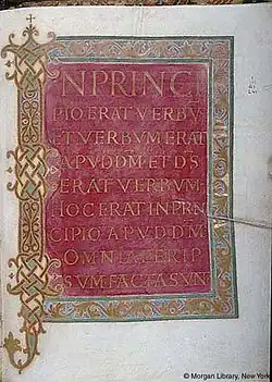 The text is the "Four Gospels preceded by the Epistle of S. Jerome: Ad Damasum, Canon Tables and Prefaces, followed by a Capitulary", written and illuminated in "a not particularly elegant" Carolingian minuscule, the miniatures perhaps or probably by Folchard of St Gall, who portrayed himself in the Folchard Psalter. The style of illumination lacks the Insular elements of that work. The borders are grand and elegant variations on classicising foliage motifs, and the large initials reflect the Carolingian development of Insular motifs such as interlace within an essentially classicising style. Six or seven scribes worked on the text, one shared with the Folchard Psalter.[15] The illuminations, unlike the covers, entirely lack human figures. The two pages imitating textiles interest scholars because many carpet pages, as their name suggests, may do the same. In both cases the idea may have been the "emulation of a textile shroud or cover", such as those used to wrap relics. Similar pages are found in the Ottonian Codex Aureus of Echternach.[16] In a similar way carpet pages may have been regarded as a form of interior cover.[17]