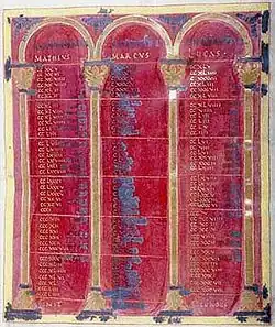 - f6r - 11v: Canon tables, on vellum dyed purple, lettered in gold and (badly oxidised) silver, with arcaded surrounds in gold and silver.