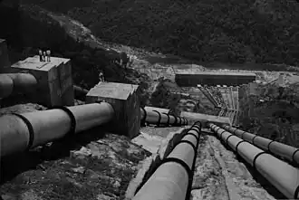 The Linganamakki Dam was constructed by the Karnataka State Government in 1964. Located in the Linganamakki village of Sagara taluk, the dam has a length of 2.74 kilometres (1.70 mi) stretching across the Sharavathi river. It is located about 9 km from Jog Falls on the same river.[1] It has an effective storage capacity of 4.29 cubic km or 151.52 tmc ft of water. The dam is used for generation of hydroelectricity in Sharavathi Valley Hydro Electric Project.