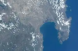 Lingayen Gulf at San Fabian, Pangasinan, with the Cordillera Central mountains in the background. | |